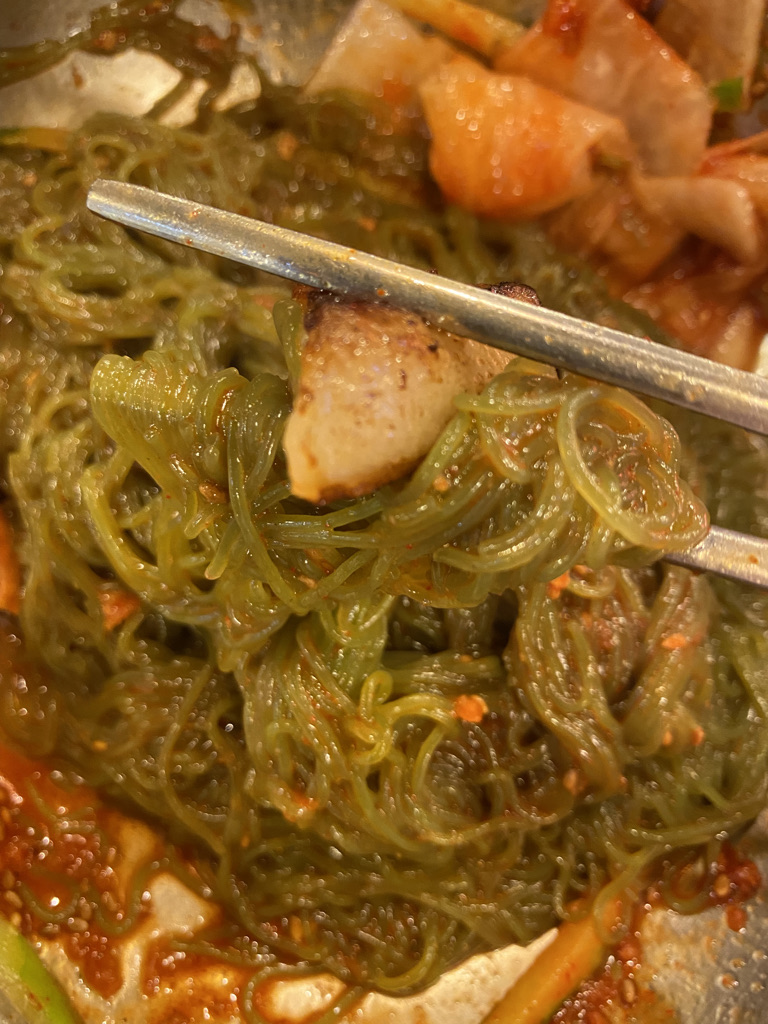 많이 볼 수 있는 비취 냉면(녹색면)으로 만들어진 냉면이고, 맛은 아주 평범한 공장 냉면 맛입니다.